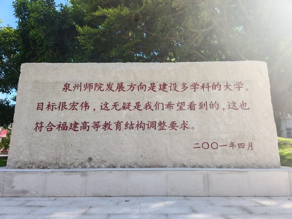 呈辉演播厅至文科楼A栋周边地块改造前为校园绿化区域,红色足迹点建设项目落地后,原地块由榕树、灌木丛生地变为平整开阔的广场,并配套铺设了阳光草坪,布设了照明设施,广场中央摆放景石,景石镌刻着习近平总书记在福建工作期间莅校考察时作出的重要指示:“泉州师院发展方向是建设多学科的大学,目标很宏伟,这无疑是我们希望看到的,这也符合福建高等教育结构调整要求”。如今,红色足迹点已成为学校红色教育实践基地,这里不仅是红色文化的生动载体,更是师生深入学习红色精神、传承红色基因、激活红色教育的重要育人场所,持续引领广大师生在红色文化熏陶中茁壮成长。