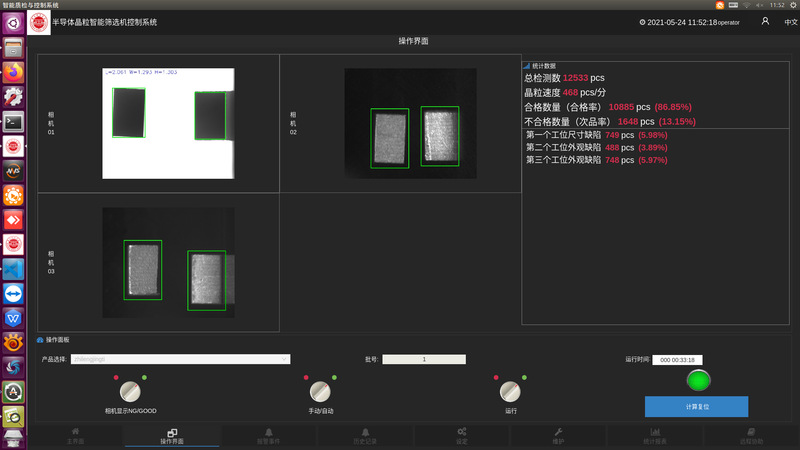 半导体致冷器件晶粒智能筛选机基于机器视觉的图像处理算法和深度学习新技术,采用Linux系统和人机交互操作UI界面,通过第1工位实现晶粒3维尺寸同时成像检测,通过第2和第3工位实现晶粒4个面缺陷同时成像检测,并采用光纤传感器的振动盘料满停机装置,以及精确的晶粒运动定位与采集同步控制,实现了对半导体晶粒(尺寸1.32*1.32*2.10mm)6.5粒/秒的匀速送料与检测,检测准确率达90%以上,检测精度达25um,解决了半导体晶粒人工检测容易产生漏检、检测准确率低、检测效率低、检测成本高等问题。实现了一台半导体晶粒筛选机可以替换5个检测员工的产能。拥有14项发明专利申请和4项授权实用新型专利。